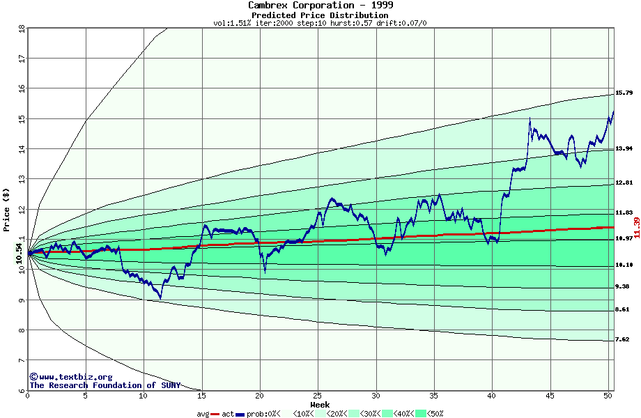The following graph plots the year-to-date performance of the stock for 1999 compared to the probability calculated by a random walk model.