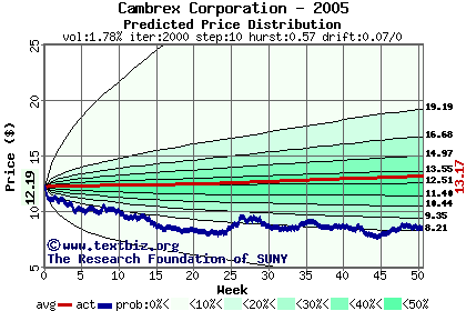 The following graph plots the year-to-date performance of the stock for 2005 compared to the probability calculated by a random walk model.