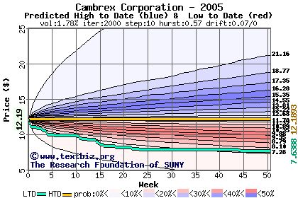 The high to date and low to date prices of the stock plotted against a random walk model for 2005 (what's this?).
