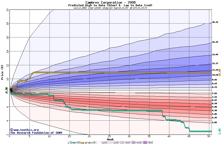 The high to date and low to date prices of the stock plotted against a random walk model for 2008 (what's this?).