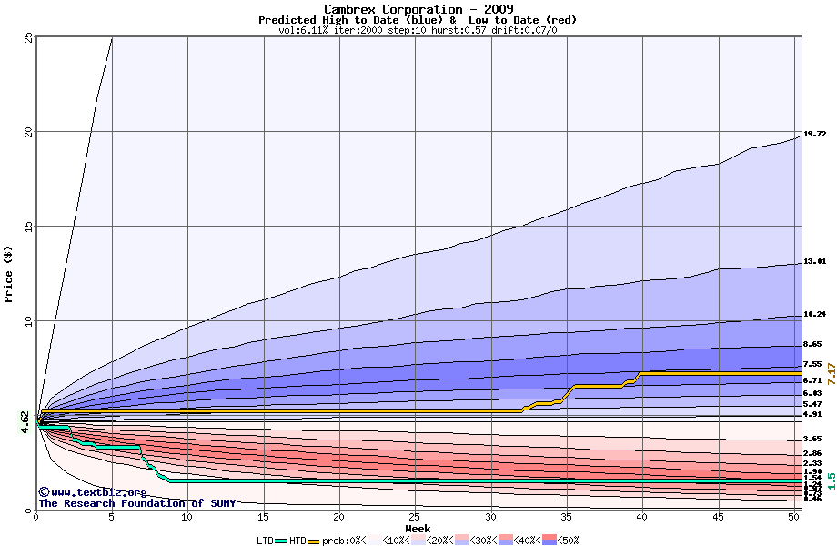 The high to date and low to date prices of the stock plotted against a random walk model for 2009 (what's this?).