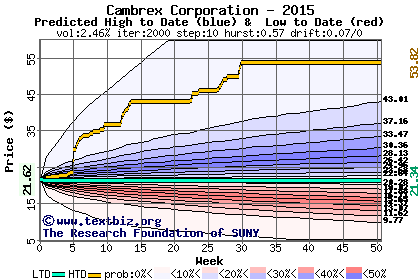 The high to date and low to date prices of the stock plotted against a random walk model for 2015 (what's this?).