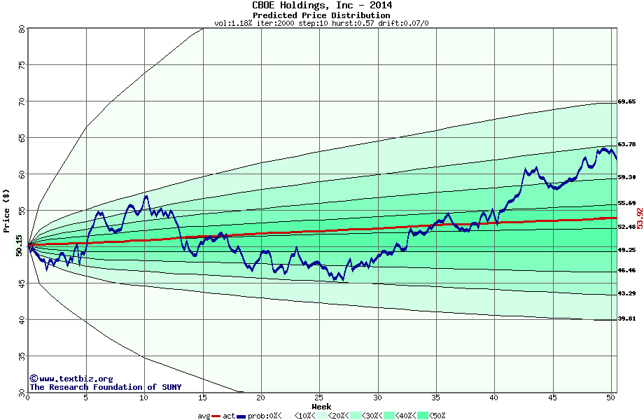 The following graph plots the year-to-date performance of the stock for 2014 compared to the probability calculated by a random walk model.