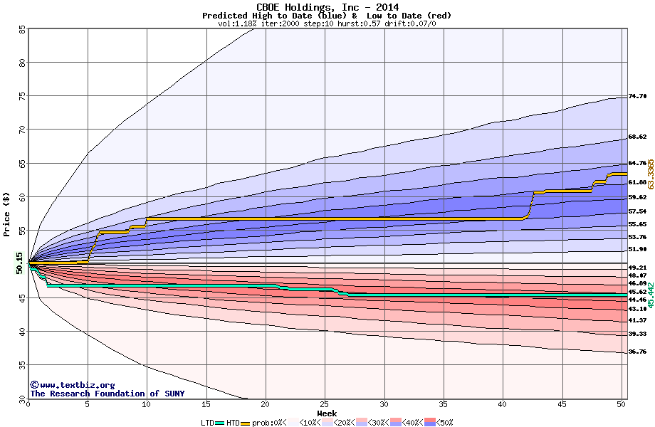 The high to date and low to date prices of the stock plotted against a random walk model for 2014 (what's this?).