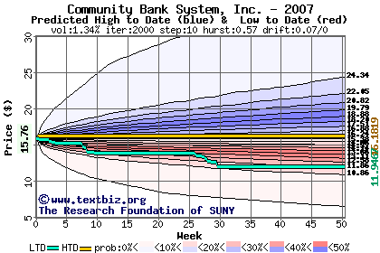 The high to date and low to date prices of the stock plotted against a random walk model for 2007 (what's this?).