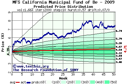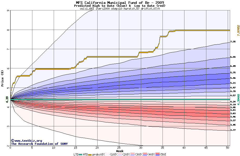 The high to date and low to date prices of the stock plotted against a random walk model for 2009 (what's this?).