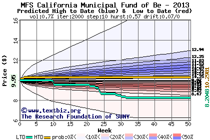 The high to date and low to date prices of the stock plotted against a random walk model for 2013 (what's this?).
