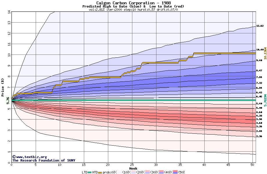 The following graph plots the year-to-date performance of the stock for 1988 compared to the probability calculated by a random walk model.