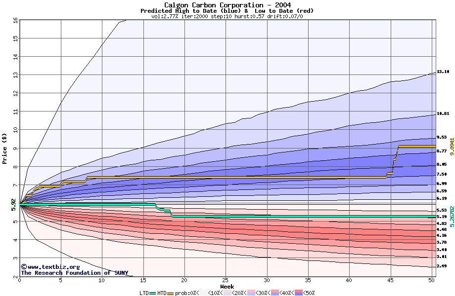 The high to date and low to date prices of the stock plotted against a random walk model for 2004 (what's this?).