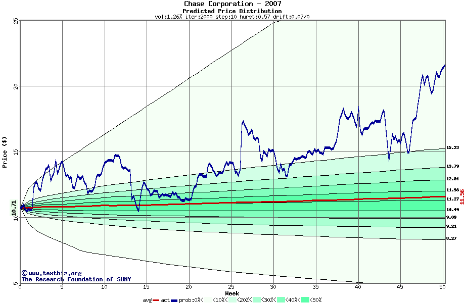 The following graph plots the year-to-date performance of the stock for 2007 compared to the probability calculated by a random walk model.