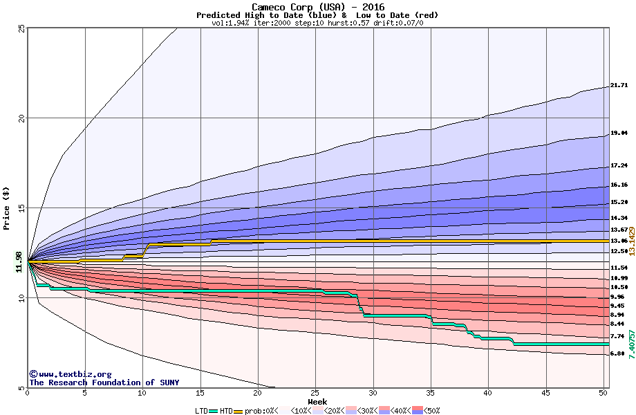 The high to date and low to date prices of the stock plotted against a random walk model for 2016 (what's this?).