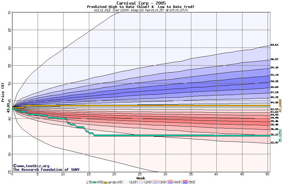 The high to date and low to date prices of the stock plotted against a random walk model for 2005 (what's this?).