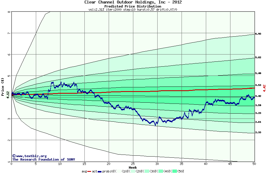 The high to date and low to date prices of the stock plotted against a random walk model for 2012 (what's this?).