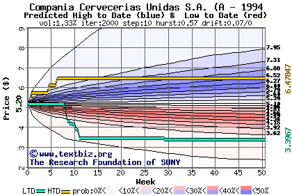 The high to date and low to date prices of the stock plotted against a random walk model for 1994 (what's this?).