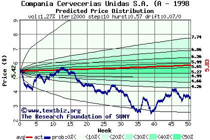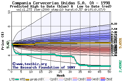 The high to date and low to date prices of the stock plotted against a random walk model for 1998 (what's this?).