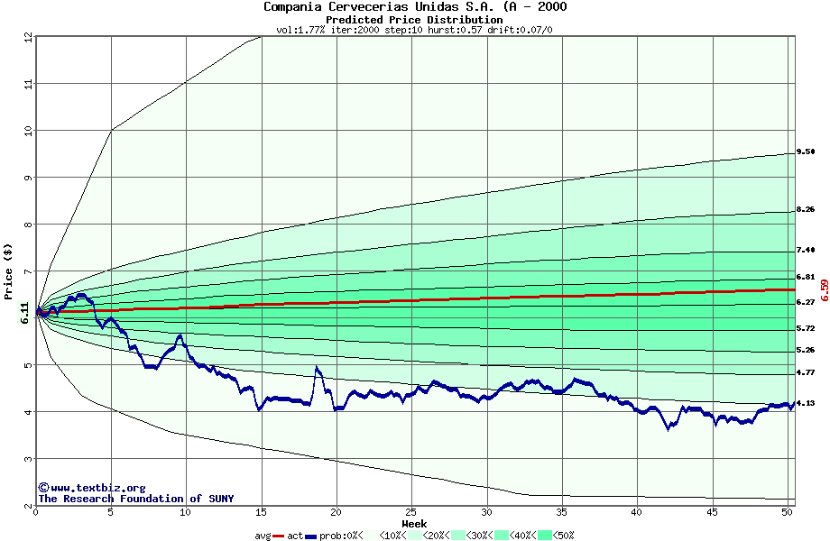 The high to date and low to date prices of the stock plotted against a random walk model for 2000 (what's this?).