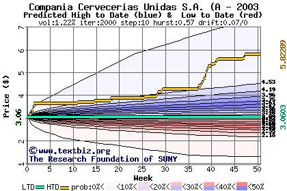 The high to date and low to date prices of the stock plotted against a random walk model for 2003 (what's this?).
