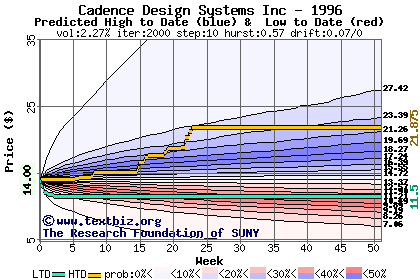 The following graph plots the year-to-date performance of the stock for 1996 compared to the probability calculated by a random walk model.