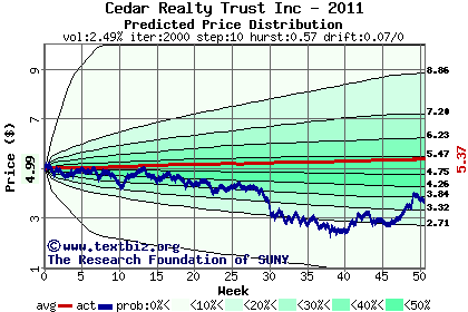 The high to date and low to date prices of the stock plotted against a random walk model for 2011 (what's this?).