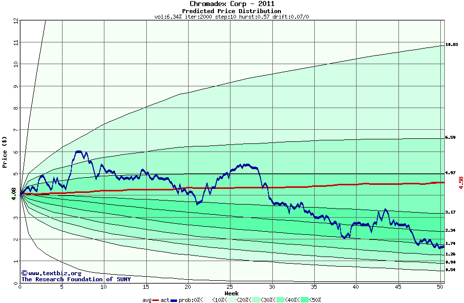 The following graph plots the year-to-date performance of the stock for 2011 compared to the probability calculated by a random walk model.