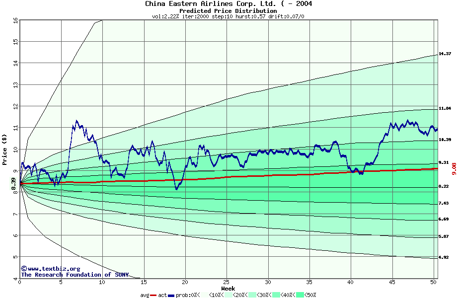 The following graph plots the year-to-date performance of the stock for 2004 compared to the probability calculated by a random walk model.