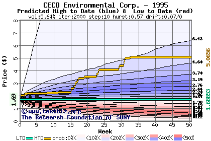 The high to date and low to date prices of the stock plotted against a random walk model for 1995 (what's this?).