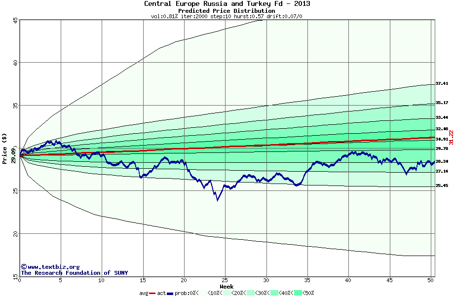 The following graph plots the year-to-date performance of the stock for 2013 compared to the probability calculated by a random walk model.