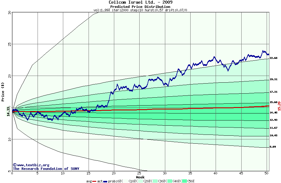 The following graph plots the year-to-date performance of the stock for 2009 compared to the probability calculated by a random walk model.