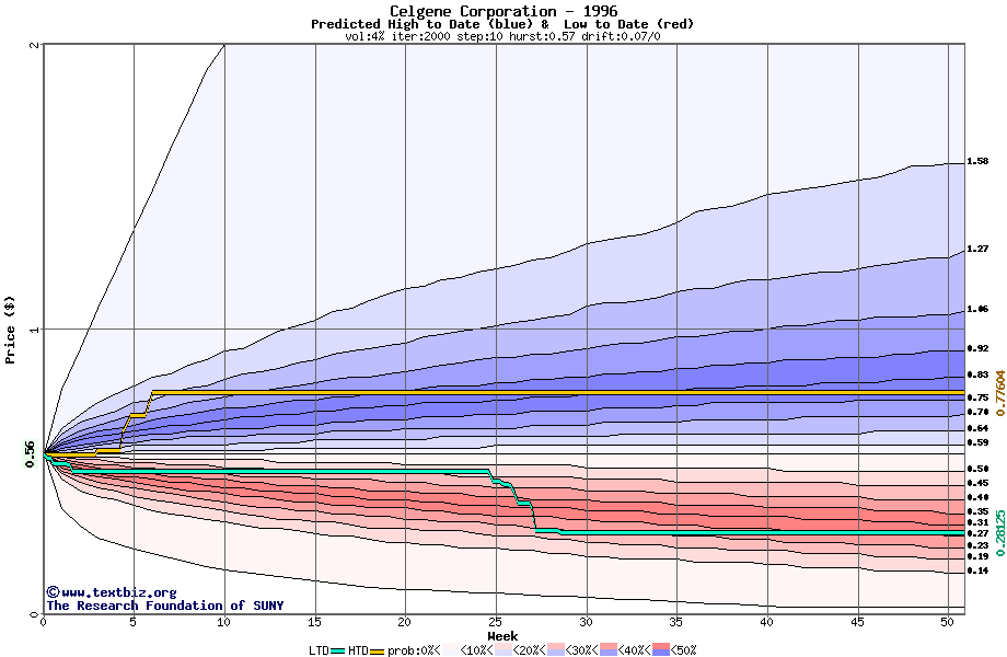 The high to date and low to date prices of the stock plotted against a random walk model for 1996 (what's this?).