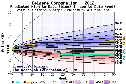 The high to date and low to date prices of the stock plotted against a random walk model for 2012 (what's this?).