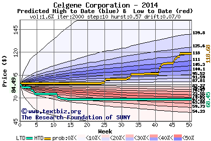 The high to date and low to date prices of the stock plotted against a random walk model for 2014 (what's this?).