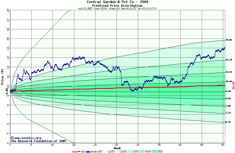 The following graph plots the year-to-date performance of the stock for 2004 compared to the probability calculated by a random walk model.