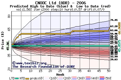 The high to date and low to date prices of the stock plotted against a random walk model for 2006 (what's this?).