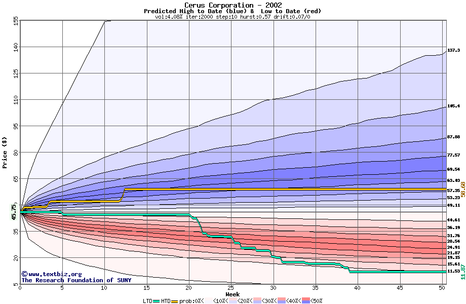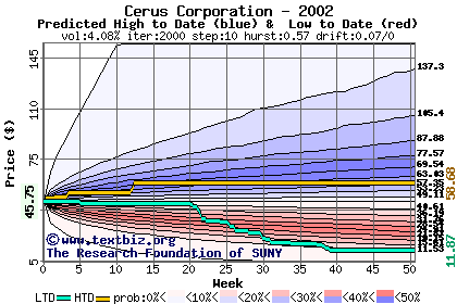 The high to date and low to date prices of the stock plotted against a random walk model for 2002 (what's this?).