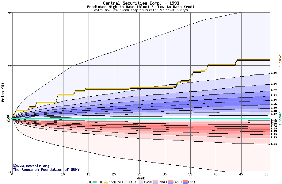The high to date and low to date prices of the stock plotted against a random walk model for 1993 (what's this?).