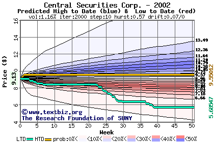 The high to date and low to date prices of the stock plotted against a random walk model for 2002 (what's this?).