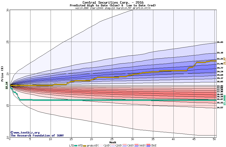 The high to date and low to date prices of the stock plotted against a random walk model for 2016 (what's this?).