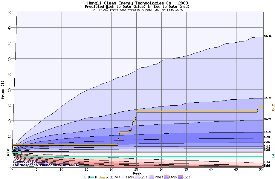The high to date and low to date prices of the stock plotted against a random walk model for 2009 (what's this?).