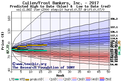 The high to date and low to date prices of the stock plotted against a random walk model for 2017 (what's this?).