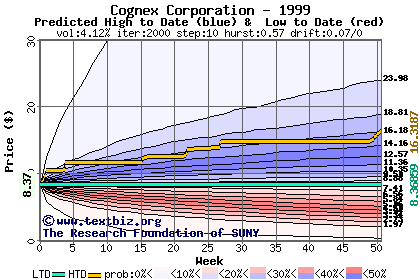 The high to date and low to date prices of the stock plotted against a random walk model for 1999 (what's this?).