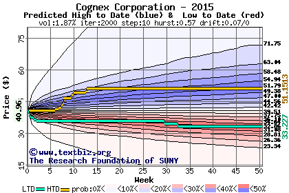 The high to date and low to date prices of the stock plotted against a random walk model for 2015 (what's this?).