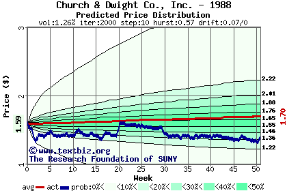 The high to date and low to date prices of the stock plotted against a random walk model for 1988 (what's this?).