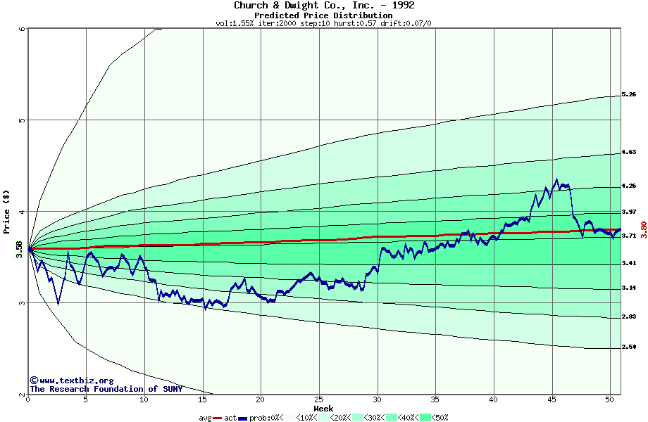 The following graph plots the year-to-date performance of the stock for 1992 compared to the probability calculated by a random walk model.