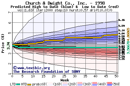 The high to date and low to date prices of the stock plotted against a random walk model for 1998 (what's this?).