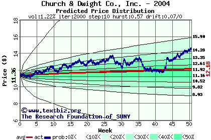 The following graph plots the year-to-date performance of the stock for 2004 compared to the probability calculated by a random walk model.