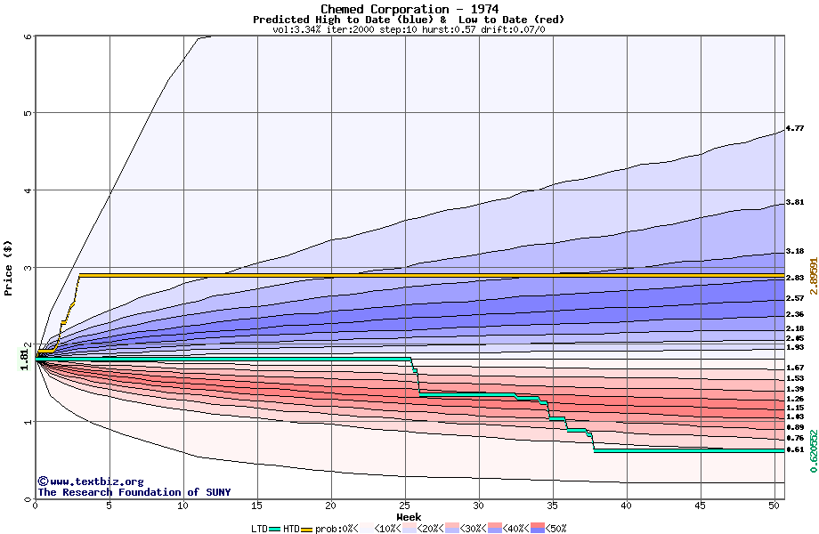 The high to date and low to date prices of the stock plotted against a random walk model for 1974 (what's this?).