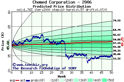 The high to date and low to date prices of the stock plotted against a random walk model for 2006 (what's this?).
