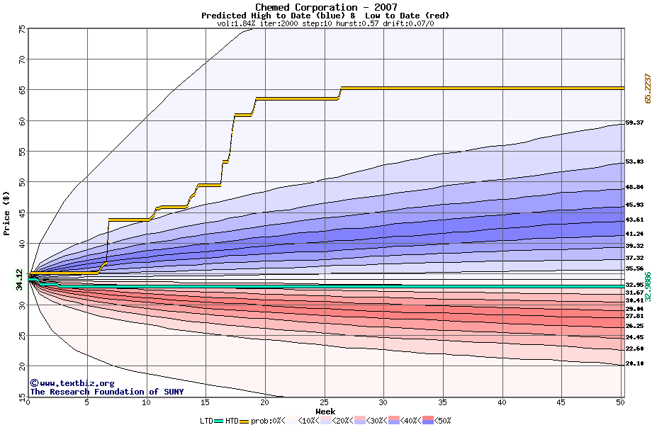The high to date and low to date prices of the stock plotted against a random walk model for 2007 (what's this?).