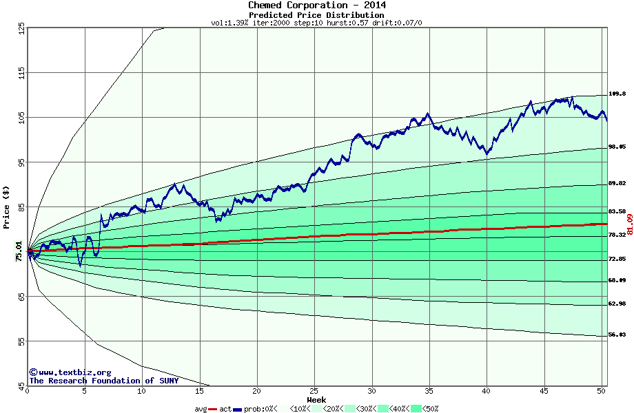 The following graph plots the year-to-date performance of the stock for 2014 compared to the probability calculated by a random walk model.