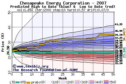 The high to date and low to date prices of the stock plotted against a random walk model for 2007 (what's this?).